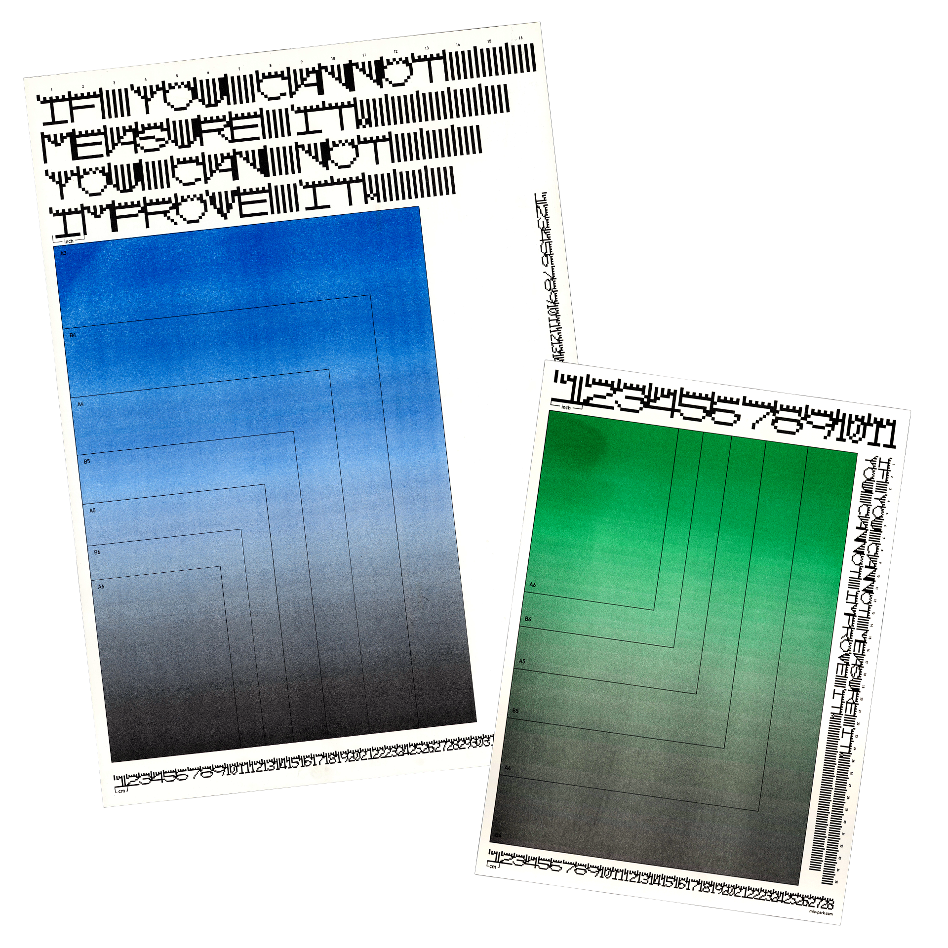 Designed with the experimental typeface 'Scale,' inspired by ruler markings. Each letter doubles as a unit of measurement—centimeter, meter, or inch—combining creativity and practicality.